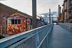 The trestle is located on 10 acres and features five furnaces with the oldest at the western end of the site dating from 1913.[2][3] In the 1960s, two additional furnaces were razed after years of disuse.[2] Railcars carried coke, limestone, and iron ore along the trestle from the Lehigh River to the blast furnaces where their contents were then dropped.[2][4] In its heyday, each furnace could produce roughly 3,000 tons of iron each day and employed 31,000 people.[2][5] Metal forged at the location helped construct the Golden Gate Bridge, George Washington Bridge, and built more than 1,000 naval and merchant ships during World War II.[5]