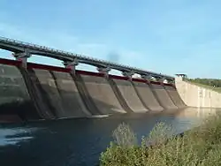 Hoover Dam, in Blendon Township, near Westerville, Ohio, dams Big Walnut Creek to form the Hoover Memorial Reservoir. This reservoir is a major water source for the city of Columbus, Ohio. It holds 20.8 billion US gallons (79,000,000 m3) of water and has a surface area of 3,272 acres (13.24 km2), or about five square miles. Construction began during 1953 due to the increased water demand of post-war Columbus. The project was completed and dedicated in 1955 and the dam officially opened in 1958. It was named for two brothers, Charles P. Hoover and Clarence B. Hoover, to honor their careers with the City of Columbus Waterworks.[2][3]