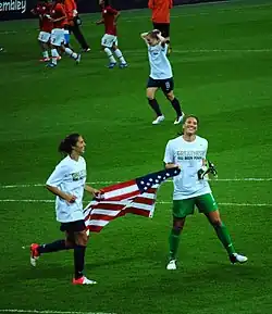 Following the match, Solo criticized Ryan's decision:[77] "It was the wrong decision, and I think anybody that knows anything about the game knows that. There's no doubt in my mind I would have made those saves. And the fact of the matter is it's not 2004 anymore. It's not 2004. And it's 2007, and I think you have to live in the present. And you can't live by big names. You can't live in the past. It doesn't matter what somebody did in an Olympic gold medal game in the Olympics three years ago. Now is what matters, and that's what I think."[78][79] Many viewed her comments as critical of Scurry's performance, although Solo released an apologetic statement the following day stating that criticism was not her intent.[80] On September 29, 2007, Ryan announced that Solo was no longer with the team and would not play in the third-place match against Norway the following day.[81][82] Team captain Kristine Lilly stated that the decision regarding Solo was made by the team as a group.[83] The U.S. defeated Norway 4–1.[84]