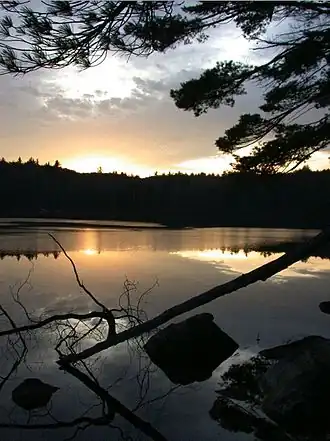 This shallow pond has an average depth of 6 feet (1.8 m), is 15 feet (4.6 m) deep at the deepest point, and covers a total area of 27 acres (11 ha).[2] It empties eastward into Mountain Brook below Elbow Pond. Mountain Brook, in turn, is a tributary of the Blackwater River, which flows via the Contoocook River and Merrimack River to the Gulf of Maine (Atlantic Ocean) at Newburyport, Massachusetts.