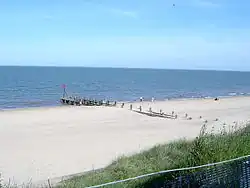 The village is sited on the East Anglia coast, beside the North Sea; it has a wide sandy beach, Hopton-on-Sea Beach, which runs by grassy cliffs.[5] The beach suffers from coastal erosion and, as of 2016, sand levels have dropped by 10 ft in the last five years. The erosion has led to a project to replace the old wooden groynes, with ones made of rock and the construction of a seawall. These defences are estimated to protect the area for up to a century.[6]