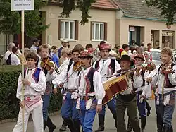 Traditional costume of Horňácko represents an important and characteristic part of local folk culture. The folk costume is classified as a "mountain-type", similarly as the folk clothing at Moravian Wallachia or Kopanice.[8] The oldest influences may perhaps come from the pagan eras. The white color is considered funereal, which is similar to the customs of the old Slavs. The characteristic embroidery of Horňácko has its roots in the Renaissance period.