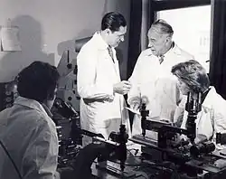 Between 1927 and 1938, he worked alternately in Paris and at the University of Iași, where he established the first laboratory of the structure of matter in Romania.[5] With the help of his advanced X-ray spectroscopy equipment he observed several previously unidentified X-ray spectral lines, and subsequently came to the decision that such lines are associated with new elements. In 1936, Hulubei together with Yvette Cauchois claimed to have discovered element 85 via X-ray analysis, conducting further research and publishing on follow-up studies in 1939.[6] With Cauchois and Sonia Cotelle, he established the presence of polonium and neptunium.[7] Hulubei also claimed and published the discovery of a new element, "moldavium", in 1936, the discovery of "sequanium" in 1939, and that of "dor" in 1945. Later, however, it was shown that the reported X-ray lines did not belong to new elements.[8] Hulubei's samples for "dor" did contain the real element 85 (astatine), but his means to detect it were too weak, by current standards, to enable correct identification; moreover, he could not perform chemical tests on the element.[9]