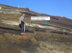 An event horizon is a bed that marks a geological event, such as an earthquake or a meteorite impact. It is the basic unit used in event stratigraphy.[5] It is related to the marker horizons in that event horizons can be used as a marker horizon, though they are not always the same. Marker horizons can emerge from more situation sources such as inland oceans, whereas event horizons are more often associated with specific events. Event horizons can also be used to indicate events in the geological record. For example, in regions such as Iceland, it is common to find deposits of tephra, a material spewed out of volcanoes in eruptions. Researchers in Iceland have been able to identify roughly 65–75% of all 200 recorded eruptions since 900 AD using the study and analysis of event horizons composed of tephra. This is just one of many important examples of the use of marker horizons and event horizons to study and date events from the past. These event horizons depending on the size of the eruption can commonly be located all over the world and throughout many volcanically active regions. Volcanic eruption deposits can often hold up better than tsunami deposits because they are not always on or near shorelines and as such are less likely to be eroded. However, unlike tsunamis, not all volcanic eruptions produce materials such as tephra that indicate an eruption. Some produce other materials that are not as likely to survive erosion.[6]