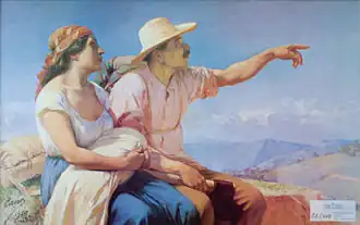 Horizons (Spanish: Horizontes) is a 1913 oil painting by Francisco Antonio Cano Cardona.[1] Horizons shows the idealized migrant family and it portrays a colono family –consisting of a husband, wife, and child– sitting on a bluff, surrounded by mountains. The three members of the family are often referred as a version of the Holy Family, with the woman dressed in colors like the Virgin Mary, with a baby on her lap.[2] The gaze of the wife, child, and father are in the direction of the man's outstretched hand, which evokes Michelangelo's Creation of Adam, and that points toward an unseen horizon.[2]
