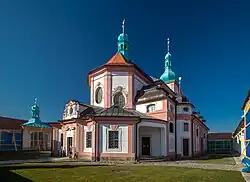 The first written mention of a church in Horní Police is from 1291, but it was destroyed during the Hussite Wars. A new small church became a well-known pilgrimage destination and had to be expanded. The current Church of the Visitation of the Virgin Mary was built in the Baroque style by Giulio Broggio on the site of the older church in 1688–1701.[7]