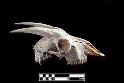 A horn is a permanent pointed projection on the head of various animals that consists of a covering of keratin and other proteins surrounding a core of live bone. Horns are distinct from antlers, which are not permanent. In mammals, true horns are found mainly among the ruminant artiodactyls, in the families Antilocapridae (pronghorn) and Bovidae (cattle, goats, antelope etc.). Cattle horns arise from subcutaneous connective tissue (under the scalp) and later fuse to the underlying frontal bone.[1]