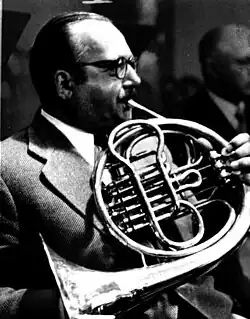 The premier was given at the Salzburg Festival on 11 August 1943 with the horn player Gottfried von Freiberg as the soloist and Karl Böhm conducting the Vienna Philharmonic.[9] The same combination recorded it soon after. Richard Strauss himself was not present at the premiere, but had been at the festival earlier and left on 9 August after conducting some all-Mozart concerts to return home to Garmisch. He had, however, worked with Böhm and Gottfried during his stay: the signed autograph manuscript used for the premiere is dated August 8. The concerto was played a second time on 4 October 1943 in Budapest in a live broadcast concert on Hungarian Radio with the horn played by Max Zimolong and Ľudovít Rajter conducting the orchestra of the Hungarian Royal Opera,[10] and a third time on 26 May 1944, again with soloist Max Zimolong and Karl Elmendorff conducting the Staatskapelle Dresden.[11] British horn player Dennis Brain performed it with the Vienna Philharmonic in 1948, later recording it with the Philharmonia Orchestra conducted by Wolfgang Sawallisch. The US premiere was given on 8 October 1948 with soloist Anthony Miranda and the Little Orchestra of New York conducted by Thomas Sherman, and a year later at the Tanglewood with James Stagliano on horn and the Boston Symphony Orchestra conducted by Eleazar de Carvalho. The concerto went on to become the most performed of 20th-century horn concertos (it was performed twice in the finals of the BBC Young Musician competition, in 1988 by the winner David Pyatt and in 2016 by runner-up Ben Goldscheider).