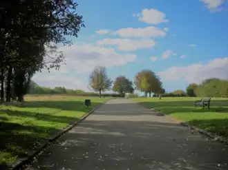 The area the park now occupies was previously the southern part of the Horn Park, one of three parks belonging to Eltham Manor, later called Eltham Palace.[1] The historic Horn Park was also known as West Horne[1][2] and Lee Park;[1] it was the westernmost of Eltham Manor's parks, and slightly closer to Lee, than Eltham.[3][4] It had also been recorded as Home Park.[5] The Horn part of the name is thought to come from Old English, meaning "a projecting horn shaped piece of land"[6] and Saxon Horne, meaning corner,[7] as it formed a projecting bulge on the edge of the Eltham parish.[2] The area and the public park are both identically named Horn Park. The direction sign outside the park at the junction of Gavestone Crescent and Alnwick Road, says Horn Park Local Park and Recreation Ground, probably to simply distinguish the park from the area, as the shops and community centre of Horn Park are in the opposite direction. The park is simply named Horn Park on maps which name it, also on the Royal Borough of Greenwich website for the park,[8] and on the signs inside the park.[7]