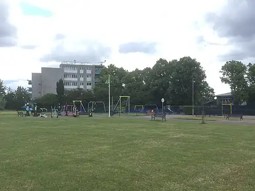 The current playground in Horn Park was constructed in 2016; the playground has been rebuilt several times since its first appearance, but has always occupied roughly the same spot adjacent to Horn Park Primary School which itself was rebuilt in 1970. There was previously a brick building on the north side of Gaveston Crescent near the playground, that was used to serve food and drink when events were being held in the park, but it was demolished in the early 2000s. Horn Park has won the Green Flag Award[8][9] several times between 2012[27] and 2021[28][29][30] The flag celebrating this was erected next to the outdoor gym.