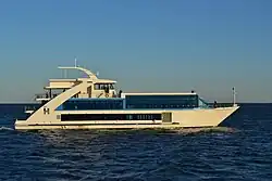 The San Francisco Hornblower Hybrid is a 64-foot-long (20 m) catamaran, with a fully enclosed main deck, and covered roof deck. In 2008 the vessel was acquired by Alcatraz Cruises, a subsidiary of Hornblower Cruises. The vessel, which was previously a commercial diving boat, underwent a retrofit, repower and refurbishment operation, at a cost of USD 4 million.[1]