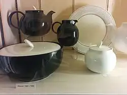 In the mid-1950s, the Rawson brothers started to recognise the potential of Philip's son, John Clappison, a student at Hull College of Art who produced the stylish, contemporary Elegance range of wares which are much in demand with collectors today.[2] In 1954, the business moved to the site of the defunct Hornsea Brick and Tile Works. At this time the Pottery also employed other noted designers such as Dorothy Marion Campbell and Alan Luckham as modeller. In 1967, the factory started to produce full ranges of tableware, the first being the John Clappison-designed Heirloom, followed by his Saffron and Bronte patterns. In the 1970s, the Queensbury-Hunt partnership became involved in Hornsea tableware design, and their Contrast and Concept ranges proved popular.[3] Though innovative, these products were not always practical in use. By 1974, the Edenfield Works employed 250 people and turned out three million pieces a year.[4]