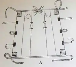 A horo was around 1.8 m (6 ft) long and made from several strips of cloth sewn together with a fringe on the top and bottom edges. The cloth strips were sewn together and formed into a sort of bag which would fill with air like a balloon when the wearer was riding a horse.[1] A light framework of wicker, bamboo or whale bone known as an oikago, similar to a crinoline, which is said to have been invented by Hatakeyama Masanaga during the Ōnin War (1467–1477),[2] was sometimes used to keep the horo expanded. Attaching the horo generally involved a combination of fastening cords and possibly a staff. The top cords were attached to either the helmet or cuirass of the wearer while the bottom cords were attached to the waist.[3] The family emblem (mon) of the wearer was marked on the horo.[1]