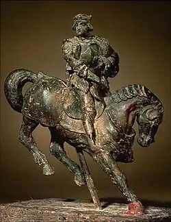 The pre-20th century history of Horse and Rider has not been established, with the first public attribution of the wax sculpture to Leonardo being made in 1987.[1] The statue was said to have been in the possession of the Melzi di Cusano family in Milan,[2][3] inherited from Franseco Melzi, a friend and protégé of Leonardo. However, no records of the statue were found in an examination of the family's archives.[4]
