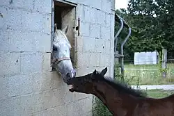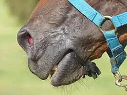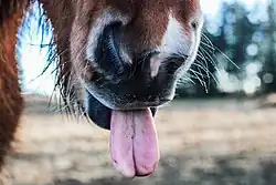 According to ethologists Gerry and Julia Karen Neugebauer, horses utilize their tongues for various behaviors, including licking, chewing, submissive gestures, yawning, and drinking.[15] Unlike cattle, horses typically do not use their tongues for mutual grooming.[16] During close exploration, horses investigate new objects by sniffing them; if the scent is appealing, they may use their lips, whiskers, teeth, and tongue to touch and taste the object.[17]