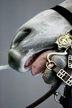 The horse tongue is highly sensitive, and therefore vulnerable to injury.[3][40] The main cause of lingual injuries in horses is from mishandling or accidents related to a bit.[3] A horse's tongue may hang over the bit for various reasons, particularly if the rider's hand is too heavy or if the bit is ill-suited to the horse's mouth, leading to a lack of control. In such cases, the horse may allow its tongue to hang out to the side.[41] This behavior is to be distinguished from tongue stereotypies, as its origin is not the same.[42] To mitigate this issue, "snaffle" bits and anti-tongue breakers can be added to the mouthpiece.[43]