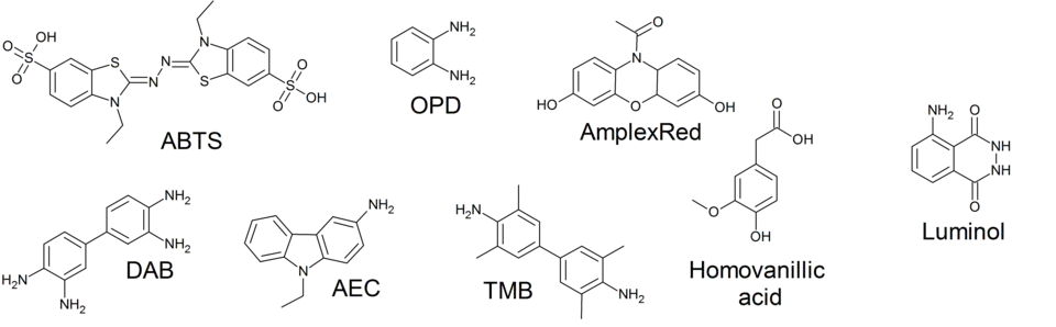 Numerous substrates for horseradish peroxidase have been described and commercialized to exploit the desirable features of HRP. These substrates fall into several distinct categories. HRP catalyzes the conversion of chromogenic substrates (e.g., TMB, DAB, ABTS) into colored products, and produces light when acting on chemiluminescent substrates (e.g. enhanced chemiluminescence by luminol).