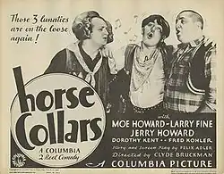Horses' Collars is a 1935 short subject directed by Clyde Bruckman and starring American slapstick comedy team The Three Stooges (Moe Howard, Larry Fine and Curly Howard). [1] It is the fifth entry in the series released by Columbia Pictures starring the comedians, who released 190 short films for the studio between 1934 and 1959.