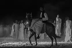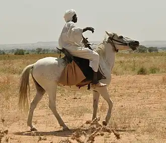 The horse constitutes a cultural heritage, particularly in the Darfur region, among the Missairiyah and the Rizeigat tribes.[4] It appears that horse racing has been practiced in Darfur since 16th century.[5] During the 20th century, a policy of improving breeding was put in place[6] with the support of local tribes, who participated in the establishment of Thoroughbreds, particularly in the Khartoum region.[4] The English imported horse racing in 1929, and built a racecourse in Khartoum, at the confluence of the Blue Nile and the White Nile.[2] They imported other equestrian practices then unknown to the Sudanese, such as polo and tent pegging. While they had no intention of teaching equestrian sport to the Sudanese, this practice survived the colonial period, equestrian sport being in full development during the country's independence in 1956.[2] According to Ahmed Mekki Abdu, first Governor of Khartoum after independence, the English re-sold their horses to the Sudanese before their departure, allowing the maintenance of large stables sometimes numbering dozens of horses.[2]