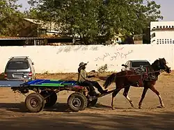 The horse is mainly used as a means of transport, traction, and more rarely as a leisure animal.[6] Horse riding is practiced in rural areas of Sudan for transportation purposes.[6] On the other hand, horse was not used, or only very little, as an agricultural aid in Central Sudan.[3] The vast majority of Sudanese horses are used as working animals, with the exception of a minority of sport horses.[6] In addition to its horse racing, Sudan is known for its tent pegging competitions, imported by the British.[4]