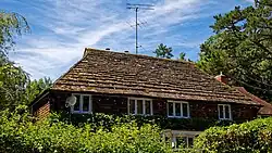In later centuries there are numerous examples in Sussex and the surrounding counties as a roofing material, particularly for mills, dovecotes, churches, manor houses and similar buildings. Completely rainproof and long-lasting, it was ideal for these structures.[2] Smaller-scale uses include road surfaces, for which the thickest slabs were typically used:[2] the footpaths leading to St Mary's Church at Shipley, the north wall of St Nicholas' Church at Itchingfield, and gravestones, fonts and tombs with examples at St Mary the Virgin's Church in Horsham and St George's Church, West Grinstead.[1] Once exposed it hardens quickly and will last for hundreds of years. The characteristic ripple marks are retained. There are redundant quarry workings throughout Sussex but just one working quarry in 2024. Large quarries at Nuthurst, and Stammerham in Southwater, are no longer extant but others survive in isolated Wealden settings.[2]