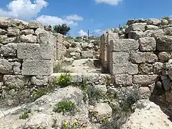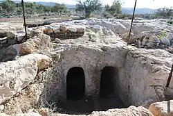 From 1978 to 1980, and again in 1983, the site was excavated under the direction of M. Gichon and Mi. Fischer from Tel Aviv University.[6][3] These excavations revealed a 30-meter section of a wall at the southwestern summit of the hill, constructed with roughly hewn stones and fillers. The wall's thickness was approximately 2.5 meters, and it was preserved up to 3 meters high. In 1980, the excavations focused on uncovering semi-circular towers flanking the southern gate of the site. These towers were based on natural rock and filler, and evidence suggested they were destroyed during the First Jewish–Roman War and reconstructed in the Bar Kokhba revolt.[6]