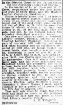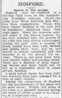 In 1910, the Hosford Lumber Company filed for bankruptcy. A 1912 article by The Pensacola Journal described Hosford as a "thriving little town." Graves Saw Mill helped foster the growth in Hosford. Visitors to Hosford could stay at the local hotel with electricity and artesian water and visit the local mineral spring. By this time, Hosford already had a local school and local church.
