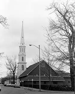 The Hospital Point Light was established to help guide ships through Salem Sound. It was originally established as a single light, but in 1927 the beacon from a lightship was used to create a range, with the existing light made the front light.[1] This beacon was set in the steeple of the First Baptist Church, the tallest spire in town; it projects a very narrow beam, only 2° either side of the range course, leading across the northern part of the sound.[3][1][5] The church was destroyed in a fire in 1975, but the steeple survived; it was incorporated into the rebuilt church.[1] The light continues in active service.