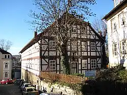 The Hospital of the Five Wounds is one of the largest half-timbered houses in Hildesheim. The address is Godehardsplatz 9–11 which is a large square in front of the Romanesque St. Godehard, but actually it is in a small and rather steep side lane. The building has four floors and a half-hip roof.
