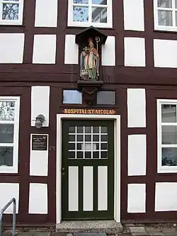 Above the portal, which was the main entrance of the building, the coat of arms of an abbot can be seen as well. The upper floors, which housed the St. Nicolai Hospital, were built in a half-timbered style. This hospital had its own entrance in the east of the building where a statue of the patron saint can be seen.