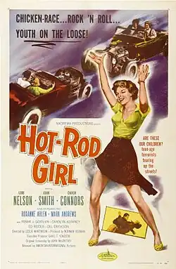 A contemporary US theatrical poster for Hot Rod Girl reads "CHICKEN-RACE ... ROCK 'N ROLL ... YOUTH ON THE LOOSE!" and "ARE THESE OUR CHILDREN? teen-age terrorists tearing up the streets!" [6]