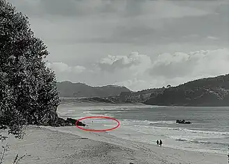 Hot Water Beach is a beach on the east coast of the Coromandel Peninsula, New Zealand, just south of Mercury Bay.[1] It is approximately 12 kilometres south east of Whitianga, and approximately 175 kilometres from Auckland by car. Its name comes from underground hot springs that filter up through the sand between the high and low water tidal reaches. The beach is a popular destination both for locals and tourists. Annual visitor numbers have been estimated at 700,000, making it one of the most popular geothermal attractions in the Waikato region.[2]