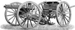 The 1-pounder revolving Hotchkiss cannon had five 37 mm barrels, and was capable of firing 68 rounds per minute with an accuracy range of 2,000 yards (1,800 m). Each feed magazine held ten rounds and weighed approximately 18 pounds (8 kg). Besides the field gun version, there were several other versions of the 37 mm Hotchkiss revolving cannon, notably versions for naval defense against torpedo boats and fortress versions firing shrapnel or canister shells for the defense of moats. At least one U.S. Army field artillery battery was equipped with five 37mm (known as 1.45-inch) Hotchkiss revolving cannons in the early 1890s, supplementing its complement of 3.2-inch breechloading rifles. The naval version was adopted by Russia and the United States, amongst others. The field cannon version was accompanied by a horse-drawn ammunition limber, which held 110 rounds plus six loaded magazines, totaling 170 rounds.[3] One example is on display at the Museum of the History of the Brazilian Army at Fort Copacabana, Rio de Janeiro.[4][5]