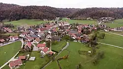 Hotedršica includes the hamlets of Griče (in older sources: V Gričih, German: Am Hügel)[2] to the north, Koš to the east, and Čajna and Log to the south. Hotedršica lies in the middle of the Hotedršica Lowland (Slovene: Hotenjsko podolje), a low-lying area extending toward Kalce to the southeast and Godovič to the northwest with karst springs and sinkholes in the surrounding foothills.[4]