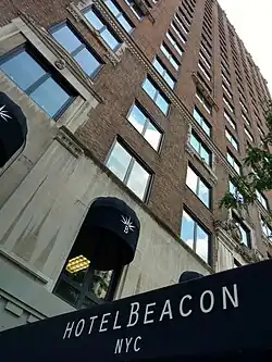 The Hotel Beacon is a Beaux-Arts, 24-story building on the Upper West Side of Manhattan in New York City, designed by Walter W. Ahlschlager.[3] It was built in 1928 at 2130 Broadway, at the corner with 75th Street, on the site of the Tilden Club House[5] and the Dakota Stables.[6]