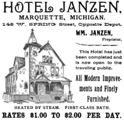 Designed by Marquette architectural firm Lovejoy and Demar,[1] the Hotel Janzen was built in either 1890[3] or 1893.[2] The railroad hotel was conveniently located near the Duluth, South Shore and Atlantic Railway (DSS&A) Depot. The hotel had 34 rooms and was advertised as having modern features such as "hot and cold water".[3] Its first proprietor was William M. Janzen.[4][5]