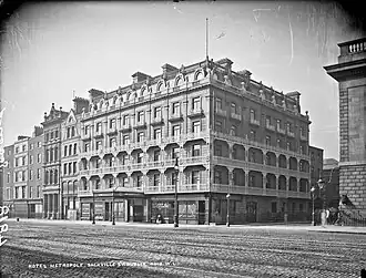 The Hotel Metropole (The Met) was a notable landmark hotel in Dublin, Ireland. It was located next to the General Post Office building in O'Connell Street. Originally four Georgian buildings, they were combined to form a unified hotel in a high-french style by architect William M. Mitchell in 1891–93. Various architectural additions and embellishments were included to make the building look more French including a mansard roof with rounded dormer windows. This followed the style other Dublin hotels were adopting at the time including the Shelbourne Hotel and nearby the Jury's Hotel at College Green.
