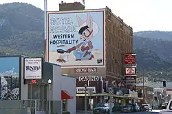 In the 1930s, a large mural of a donkey dressed as a cowboy was painted on the hotel's east exterior wall.[14][86][87] It was the largest mural in the entire state at the time.[14] By 1997, the donkey mural had been restored by Stephanie Bruegeman, an art teacher who also worked at Hotel Nevada as a secretary.[3][79] In 1999, local artist Larry Bute painted 7-by-12-foot murals on the building's exterior, depicting 19th century cowboys in a saloon.[81][88] Bute also spent a week painting murals in each hotel hallway on each floor. The casino floor also received a mural.[53]
