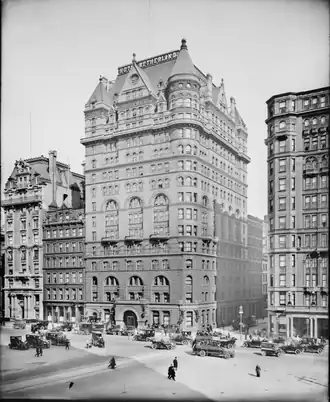 Built in 1892-93 to a design by William H. Hume for William Waldorf Astor, its original lessee was Ferdinand P. Earle.[1] The structure was 234 feet (71 m) in height with 17 stories, making it the "tallest hotel structure in the world". The structure was among the first steel-framed buildings in the city and it enjoyed a reputation for being a very fashionable hotel and location in its day. It was classified as a luxury hotel, rather than one with apartment accommodations as it provided permanent accommodations to its residents, albeit without kitchens.[2] Meals were served in the hotel's dining room, the Louis Sherry restaurant. Renamed the Hotel Netherland in 1908, the neo-Romanesque structure was razed in 1927, replaced by the Sherry Netherland Hotel.[3]