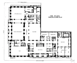The hotel has a steel frame superstructure with hollow tile floors, as well as wired-glass enclosures around all stairways and elevators.[30] Originally, five marble staircases led from the ground floor to all of the other floors.[44][45] As constructed, the stories above the ground floor surrounded a large courtyard,[36] which was covered over with office space in a 1940s renovation.[32][46][47] Hardenbergh, in designing the Central Park South foyer, had believed the lobby to be the most important space in the hotel,[48][49] as did Warren and Wetmore when they designed the Fifth Avenue lobby.[50][51] Furthermore, Warren and Wetmore had thought restaurants to be the second most significant space in a hotel, in designing the Terrace Room.[50][52]