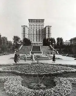 Thus the modern hotel building dates to 1948 when a joint group of architects headed by the chief Architect of Kyiv Aleksandr Vlasov and included A.Dobrovolsky, A.Malinovsky, V.Elizarova, B.Priymaka, A.Zavarova amongst many others. However, in 1949 Dobrovolsky took the position of the head after Vlasov moved to Moscow.