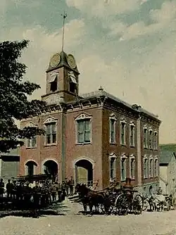 The new fire hall was built in 1883[3] and its bell was cast in 1884[4] by Centennial Bell Foundry, G. Campbell & Sons, Milwaukee Wis. The Continental Fire Company occupied the basement, which housed horses, and the main floor, which stored fire engines.[2] Village offices were on the second floor.[3] The Michigan Mining School, now Michigan Technological University, held its first classes on the second floor and in the basement from 1886 through May 1889.[1][5][6][7] In the early 1900s, the building was extended to the north to store more oats and hay for the horses.[2] In 1916, an addition was built on the western side to store two more fire engines.[3]