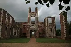 Houghton House is a ruined mansion house in the parish of Houghton Conquest, Bedfordshire. It is a Grade I listed building,[1] positioned above the surrounding countryside, and commands excellent views. Built from 1615 to 1621, it is said that the house was the model for House Beautiful in John Bunyan's The Pilgrim's Progress (1678). It was abandoned in 1794 and stripped (by the owner) of its interiors and roof for sale as building supplies. Today the property is owned by English Heritage, and is open to free public access during daylight hours.[2]