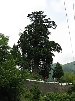 In the Edo era, the felling of trees such as cryptomeria, Chamaecyparis obtusa, Zelkova serrata, firs (Abies), Tsuga sieboldii, or Torreya nucifera was prohibited.[9][10] After the Meiji Restoration, trees which were around the cryptomeria tree were cut down, and the area became a Japanese tea plantation.[11][12] The local people held shinto ceremonies at the local guardian shrine called Suga Shrine on July 12 and October 13 (Festival) thanking the sacred tree. They cleaned the shrine every month. In the summer of 2003, a branch of the tree was broken but the tree was restored to health with the treatment by an arborist.[13]