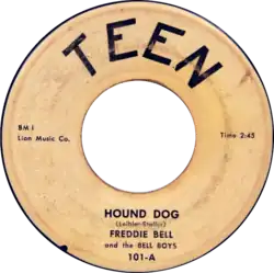 On March 7, 1953, "Hound Dog" was advertised in Billboard, and reviewed positively on March 14, 1953, as a new record to watch, described as "a wild and exciting rhumba blues" with "infectious backing that rocks all the way".[46] According to Johnny Ace biographer James M. Salem, "The rawness of the sound combined with the overt sexuality of the lyric made 'Hound Dog' an immediate smash hit in urban black America from late March to the middle of July 1953."[47] "Hound Dog" took off immediately and looked like a national hit record. Rufus Thomas quickly recorded an answer song called "Bear Cat" on Sun 181. Thornton's record was such a big seller that Peacock Records had three new pressing plants running full-time to try and keep up with demand.[48] Debuting in the charts on March 28, 1953,[26] it spent fourteen weeks on the Billboard Rhythm and Blues charts,[49] seven of them at number one.[50] By April 30, 1953, Cash Box magazine listed the song as "the nation's top-selling blues record", and it topped the charts in New York, Chicago, New Orleans, San Francisco, Newark, Memphis, Dallas, Cincinnati, St. Louis, and Los Angeles.[51] "By mid summer, it is obvious that "Hound Dog" will be the biggest seller in the history of Peacock Records."[48] The song was named as the Best Rhythm and Blues song of 1953 by Cash Box magazine,[6] and was ranked number three on Billboard's Best Selling Rhythm & Blues Chart for 1953.[52]