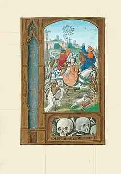 The Office of the Dead features a version of a rather unusual composition to be found in the Hours of Mary of Burgundy, Berlin showing Mary on horseback in the legend of the three living and three dead creatures. This miniature may well suggest that that book was commissioned for a woman or for someone closely related to the Duchess of Burgundy.