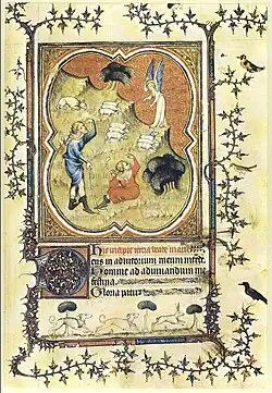 In Annunciation to the Shepherds on folio 100r, two shepherds are depicted holding hockey-style clubs, or houlettes, which are tools used for collecting stones and earth for throwing at disobedient sheep when they wander from the herd.[2] A dog wears a spiked collar to protect the shepherds and the sheep from being attacked by wolves or bandits.[2] The dog suspiciously contemplates the Angel hovering above the scene.[2]