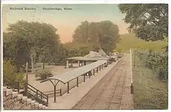Service between Bridgeport and New Milford began in February 1840.[6] The remainder of the Housatonic Railroad opened for business from New Milford to the New York state line in December 1842 (construction on the Berkshire Railroad had begun in February 1841, and the West Stockbridge Railroad opened in 1838). The Berkshire and West Stockbridge railroads were both leased within the following year.[4] In 1847, the Housatonic received a new charter for the Stockbridge and Pittsfield Railroad, a northward extension to Pittsfield. Here, a second connection would be made with the Western Railroad. Construction started in 1848 and the new line opened in 1850, with the Housatonic leasing the Stockbridge and Pittsfield during construction.[7] The extension became part of the Housatonic's main line, while the original alignment to the New York border provided an alternative route for freight trains.[7]