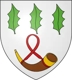 There were no known seals for Burnett of Leys before 1621.[24] In 1550 Burnet of Burnetland (later Barns) appealed to the then Lord Lyon King of Arms to change his motto to that already in use by Burnett of Leys, Virescit vulnere virtus (strength draws vigour from an injury).[25] Apparently successful, the Burnett of Leys lord then began using the motto Alterius non sit qui potest esse suus (he would not be another's who could be his). The earliest arms for Burnett of Leys was found on a carved panel dated to some thirteen years later showing the impaled arms of Burnett and Hamilton commemorating the marriage between Alexander Burnett (1500–1574) and Janet Hamilton (d.1557).[25] The arms of Burnett of Leys in 1553 used a shield, charged with three holly leaves and a hunting horn, blazoned: Argent, three holly leaves in chief vert and a hunting horn in base sable stringed Gules. The crest, a hand holding a knife shown pruning a vine had the motto: Alterius non sit qui potest esse suus (same meaning as above) or a marriage variant: Alterius non sit qui suis esse potest (who can be his would not be another's).[26] The next progression was that of Thomas Burnett of Leys, knighted in 1620, whose seal of Bore a shield with holly leaves and hunting horn, set within foliage decoration with his name and rank but no crest or motto.[26] By 1627 and upon completion of Muchalls Castle, the impaled arms of Sir Thomas Burnet and his second wife Janet Moncreiffe now had supporters. On the dexter side was a huntsman in contemporary dress with a hunting horn suspended from his shoulder while the sinister supporter was a greyhound with a collar.[27] In addition to the current motto, displayed beneath the supporters, was the motto above the hand, knife and crest, apparently ignoring the ruling of 1550 by the Lord Lyon Sir David Lindsay, the previous Burnett motto: Virescit vulnere virtus.[27]