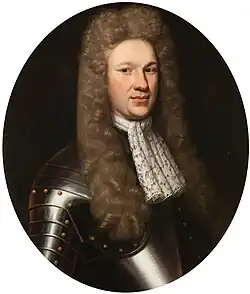 James Burnett, the next younger brother of Sir Thomas Burnett, 1st Baronet, married Elizabeth Burnett as mentioned above. Their second son, Thomas Burnett of Kemnay was the first laird of Kemnay.[35] Thomas was a writer in Edinburgh and married Margaret Pearson, daughter of John Pearson, a merchant in Edinburgh.[36] He purchased Kemnay from Sir George Nicolson, Lord Kemnay, a Lord of Session in 1688.[35] Thomas died in November 1688 and is buried in Kemnay parish church.[37]
